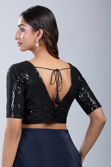 Black blouse featuring sequin work and a deep V-neckline.