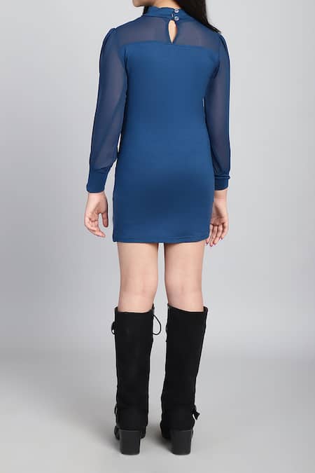 Blue Viscose Fabric Flowers Sheer Sleeve Dress