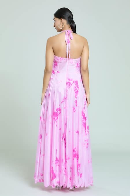 Pink halter neck maxi dress featuring all-over shibori patterns
