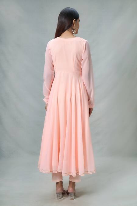 Peach anarkali featuring a round neckline, full sleeves, and a gold stripe on the hem. Paired with a solid cotton pant and gota embellished dupatta.