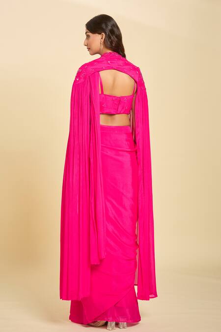 Pink solid pre-draped saree featuring pleat detailing. Paired with a sequin, bead & cutdana embroidered blouse. Comes with a floral embroidered cape.