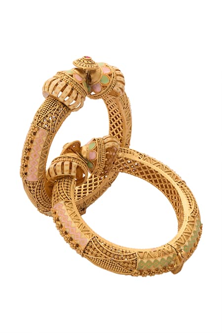 Gold bangles featuring carved floral motifs and jadau embellishments. This set includes two intricately designed bangles with a unique blend of traditional artistry.