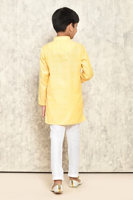 Yellow cotton kurta featuring an all-over stippled pattern with front potli buttons and side slits. Paired with white pants that have a front drawstring closure.