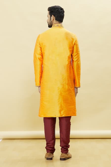 Orange kurta featuring floral embroidery on the placket and collar. Paired with a maroon churidar with drawstring front and side slits.
