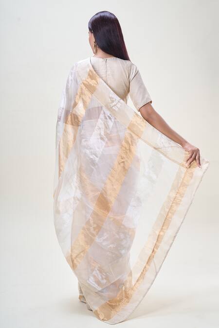 Off white saree featuring woven stripe motifs and a matching padded blouse. The saree is made from tissue fabric and the blouse from georgette, providing a light and elegant drape.