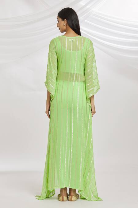 Green kaftan featuring a zari stripe pattern with gota lace detail. Paired with a matching inner and pant, designed for a relaxed fit.