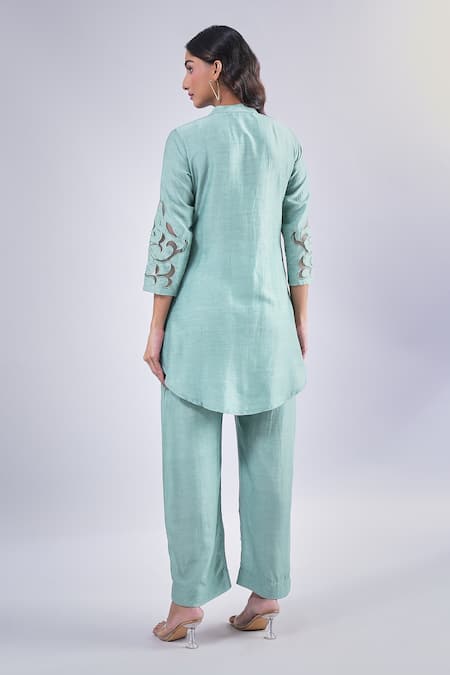 Green kurta featuring multi-color thread embroidery in flower pattern. Paired with a coordinating pant that has a semi-elastic waistband and pockets.