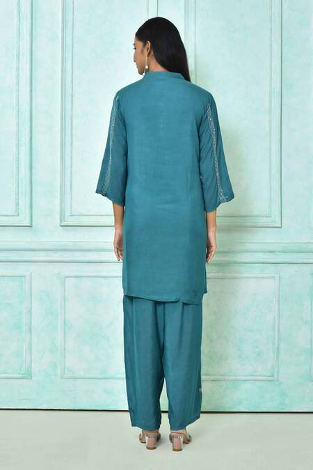 Green kurta featuring threadwork patterns highlighted with sequins. Paired with matching pants with an elasticated waistband.