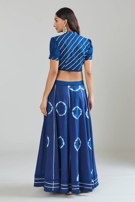 Blue Pure Cotton Lace Mandarin Collar Tie-dye Pattern Lehenga Set