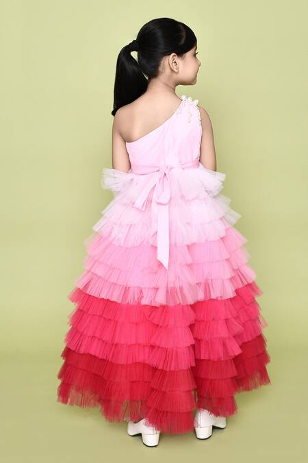 Buy_Petite Pomme_Pink Net, Cotton Pearls Tiered Ruffle One Shoulder Gown_at_Aza_Fashions