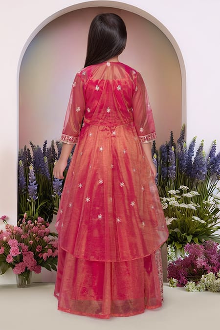 Tomato red lehenga featuring sequin and embroidered details. Paired with a matching blouse and jacket made of tissue fabric.