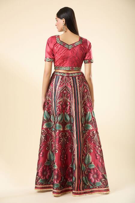 Multi colored lehenga featuring 3D tropical leaf prints, paired with a coordinating printed blouse and dupatta. The blouse has a glass neck and short sleeves, while the lehenga has a side zip closure.
