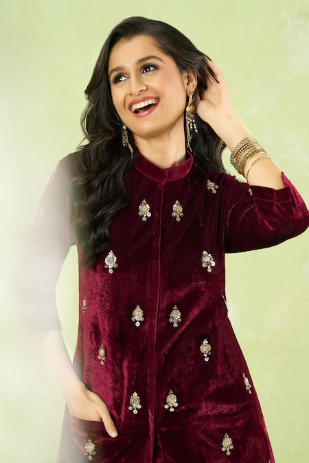 Maroon velvet kurta featuring hand embroidery and two front pockets. Paired with a coordinating maroon velvet farshi salwar.