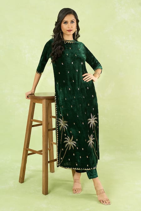 A deep green velvet straight long kurta featuring scattered sequin embellishments and palm tree hand embroidery on the hem and side slits. It is paired with coordinating velvet pants.