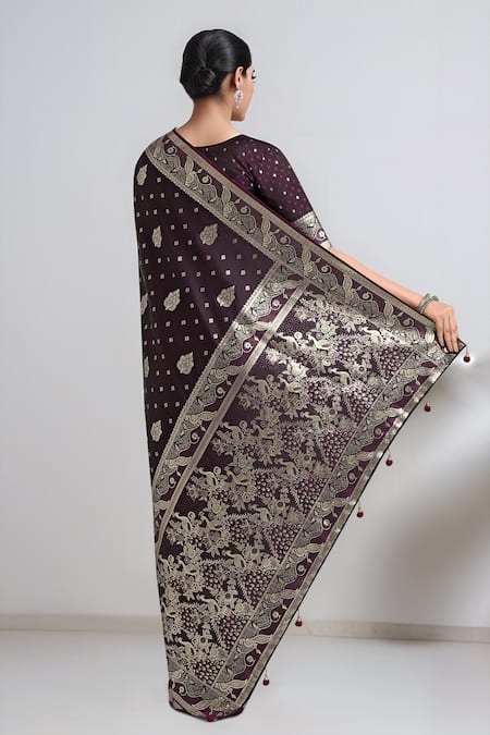 Wine saree made from Banarasi satin silk featuring zari woven ethnic motifs. Paired with a matching blouse adorned with intricate patterns.