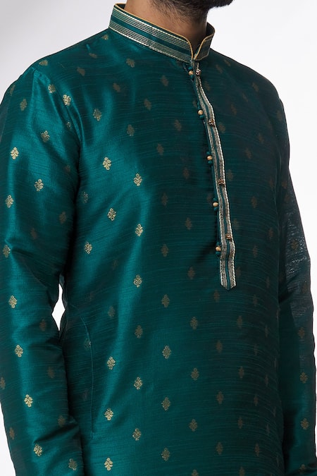 Green kurta featuring a woven floral butti pattern, resham embroidered mandarin collar, and embellished buttons. Paired with a gathered churidar in art banarasi silk.
