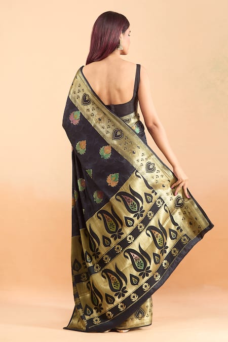 Black saree crafted in silk blend featuring woven floral and paisley motifs. Comes with a running blouse piece.