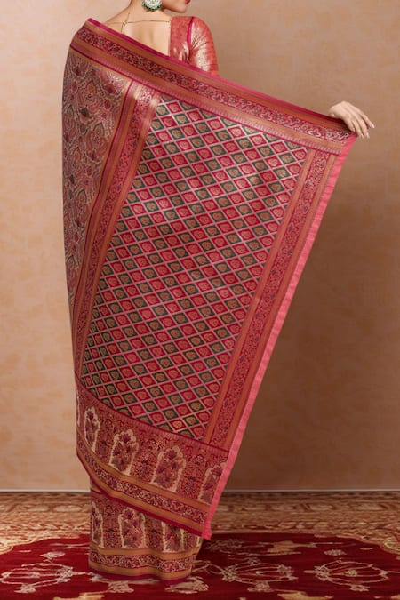 Intricate woven zari detailing throughout the saree., Contrast border with geometric patterns., Matching blouse with a rich texture.