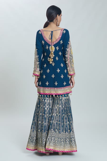Blue kurta featuring full sleeves, round neckline, and embellished floral zardozi patterns. Paired with a can can attached sharara and dupatta with intricate detailing.