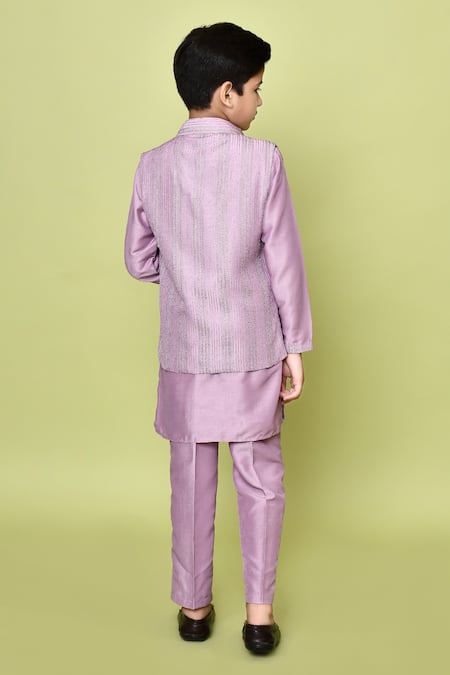 Pink kurta featuring a mandarin collar and front button closure. Paired with a zari embroidered sleeveless nehru jacket and matching trouser.