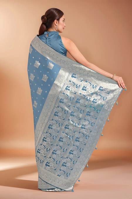 Blue saree made from Banarasi satin silk featuring intricate zari woven work. Comes with a matching blouse.
