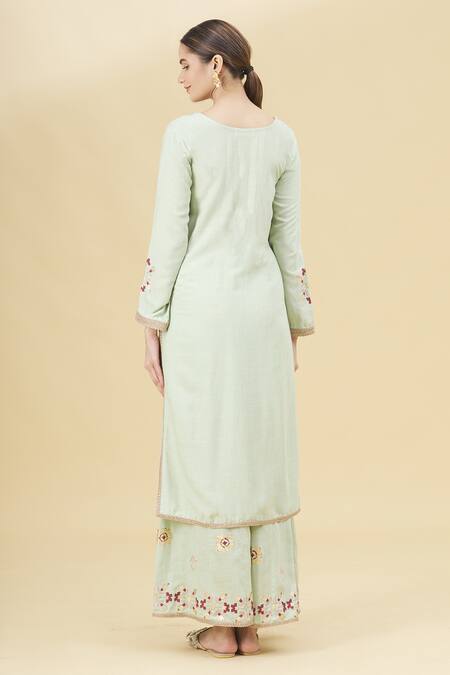 Pastel pistachio green straight kurta with placement floral motif block print. Comes with flared pants & chanderi peach tassel dupatta.
