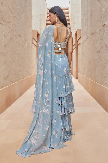 Ice blue pre-draped saree with magnolia printed motifs & ruffle layers. Paired with printed puff sleeve blouse & belt.