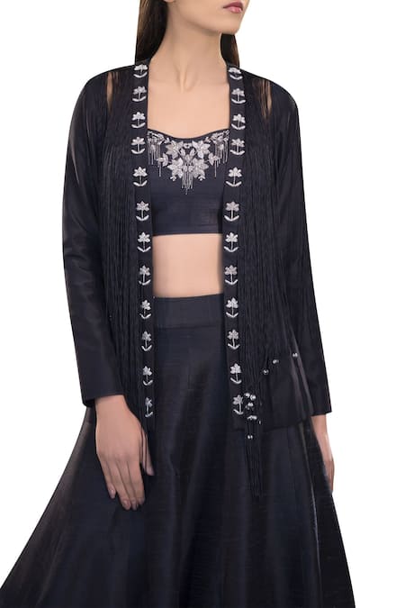 If you favor black and glossy raw silk fabric, then pick this resplendent and luxe black lehenga, teamed up with an embroidered silk fringe jacket and a bustier blouse.