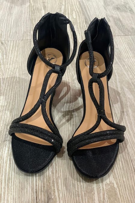 Black heels featuring a crisscross string design and stone embellishments