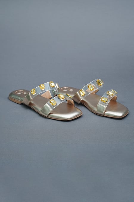 Silver open toe flats crafted in vegan leather featuring bloom shaped tonal stone embellishments on a transparent strap