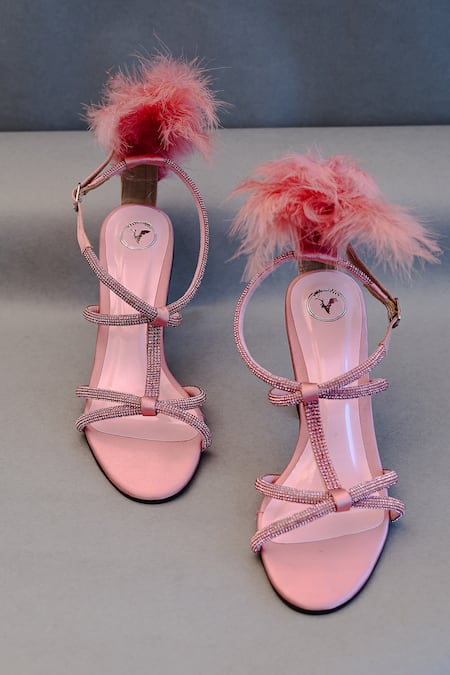 Pink spool heels featuring open toe design with tonal rhinestones embellished intertwined cord straps