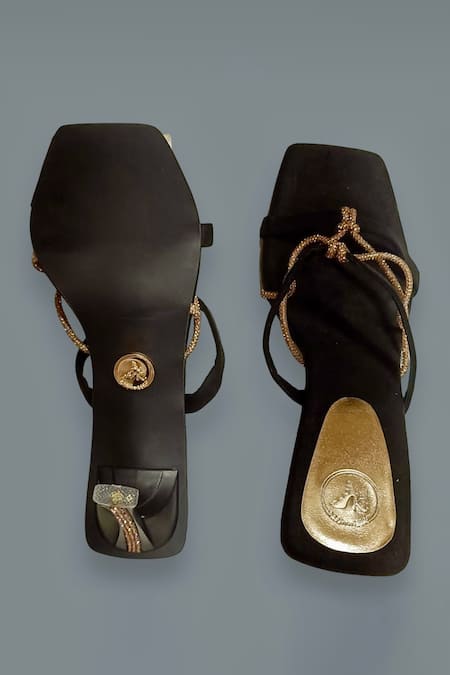 Black heels featuring a knotted design with diamond studded embellishments on the strap