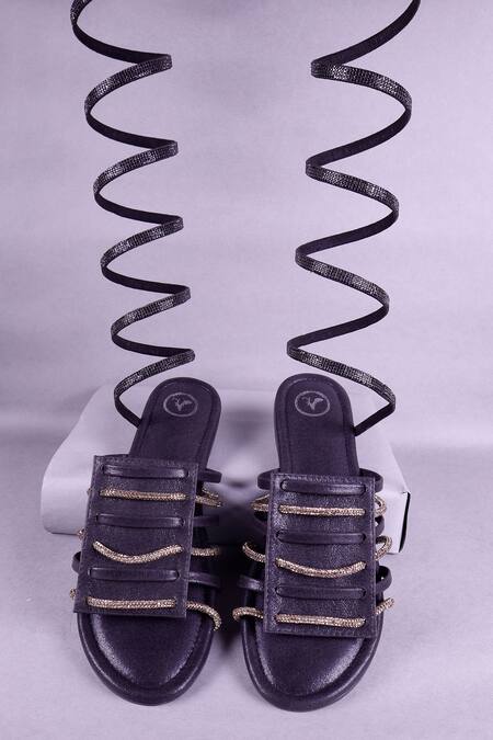 Black rhinestone embellished ankle wrap strap flats featuring a slip-on closure