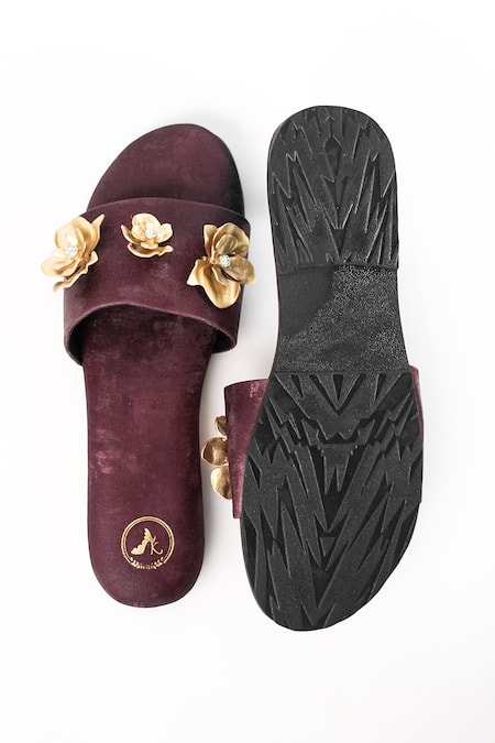 Maroon flats featuring rose bloom embellishments