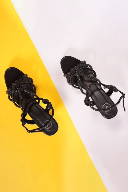 Black heels featuring an open toe design with rhinestones embellished knotted cord straps and ankle buckle straps