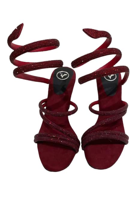 Deep red Swarovski stones on spring straps, Cushioned footbed for comfort, Textured and patterned outsole