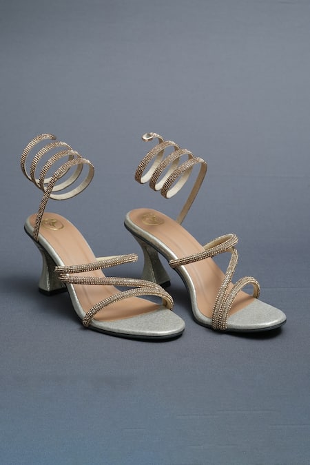 Gold heels featuring rhinestone embellishments on spring strap and round toe detailing