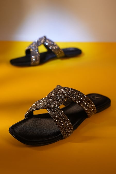 Black flats featuring open toe design with stone embellished intertwined cord straps