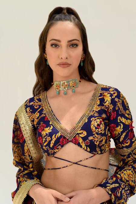 Blue Silk Embroidery V-neck Versailles Floral Pattern Blouse Lehenga Set