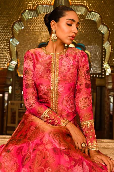 Pink kalidar lehenga set featuring floral print with gota, moti, and sequins embroidery. Paired with a matching dupatta and full sleeve blouse.