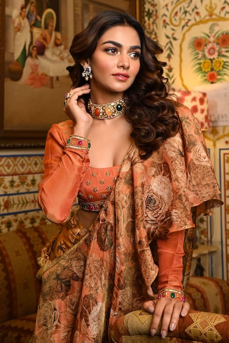 Peach pre-draped saree featuring floral print and soft ruffles detailing. Paired with a gota, sequins, and moti embroidered solid blouse.