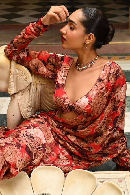 Red silk chiffon pre-draped saree featuring floral print and soft ruffles detailing. Paired with a coordinating full sleeve blouse.