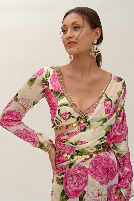 Tasseled blouse with floral patterns, Tiered ruffles along the saree, Intricate floral design on fabric