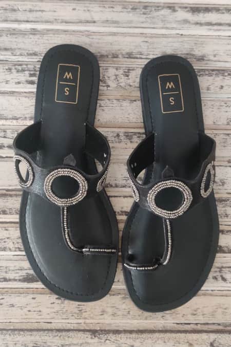 Black sandals featuring embroidered gunmetal beads and cutout straps