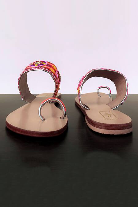 Pink sandals featuring embellished beads and circular motif work