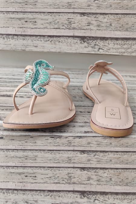 Aqua sandals featuring a 3D seahorse cutout motif and embellished multi-beads