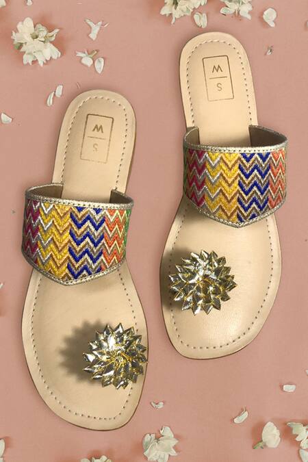 Multi-color sandals featuring embroidered zari and thread work straps with a chevron pattern