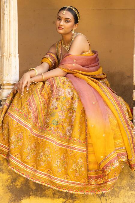 Yellow lehenga featuring hand embroidery with floral and chintz prints, embellished with kasab, beads, cutdana, and tassels. Paired with a padded blouse and a dupatta.