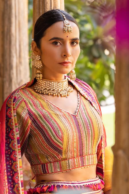 Wine lehenga featuring floral and chintz prints with cutdana, beads, and tassels hand embroidery. Paired with a padded blouse and a dupatta.