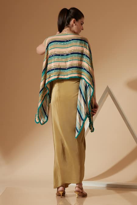 Green crepe short kaftan top featuring a striped print with sequins and cutdana embroidery. Paired with a draped cowl skirt for a coordinated look.
